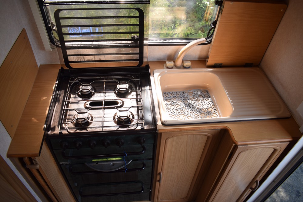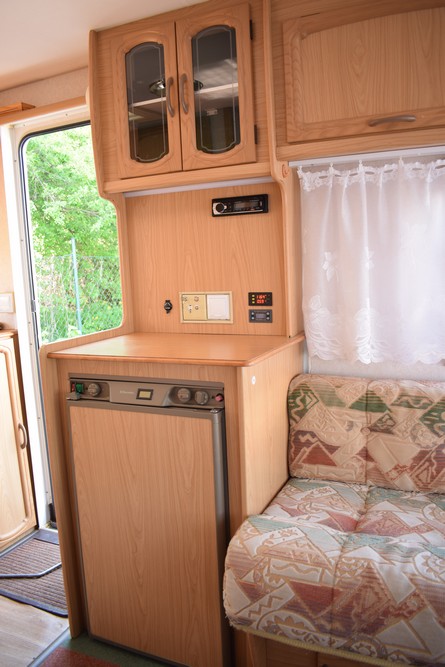 Kuchyň: vedle dřezu se studenou a teplou vodou je vařič se 4 plynovými hořáky. Kromě vařiče je instalována také plynová trouba s grilem. Plynová trouba je vybavena termostatem. V kuchyňce je lednička s mrazícím boxem. Lednička může chladit na plyn, nebo 220V pokud jste připojeni k síti, nebo na 12V během jízdy (auto musí mít 13 pin zásuvku).