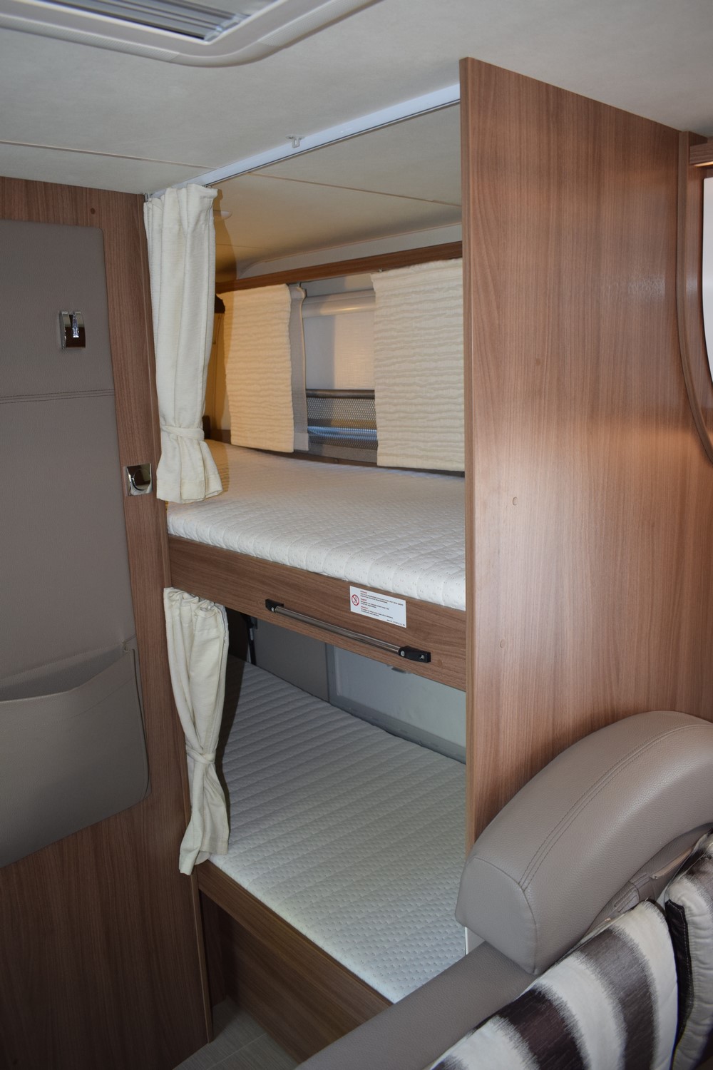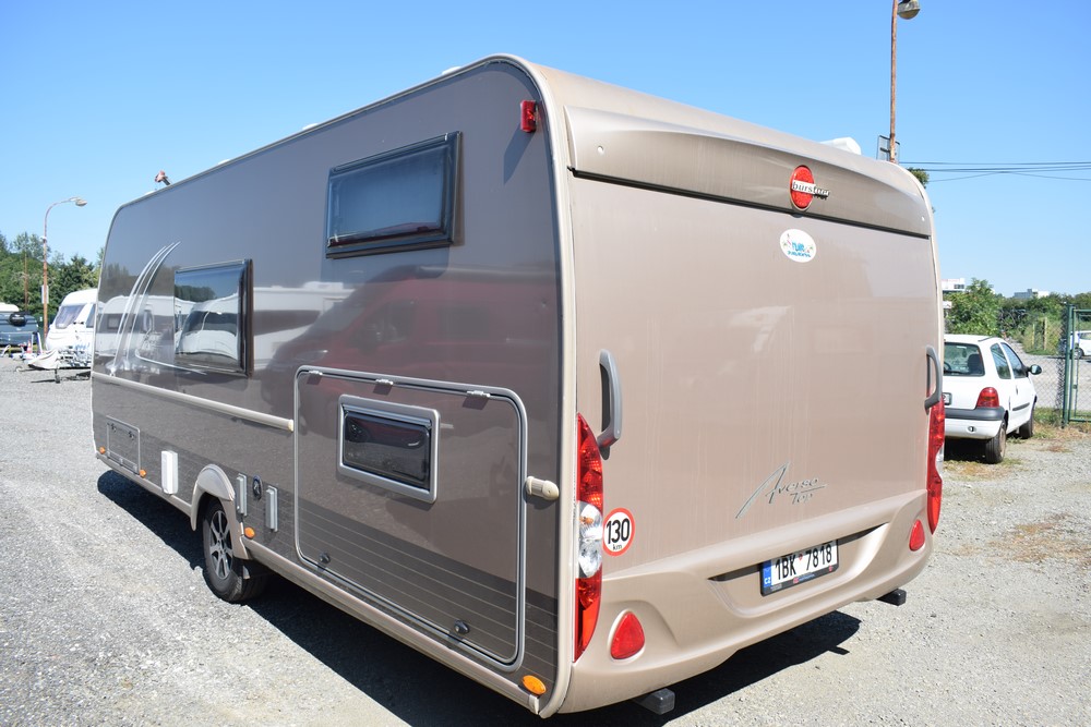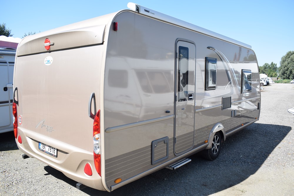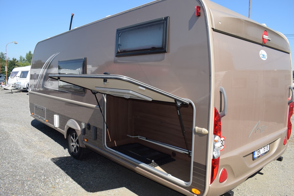 Pětilůžkový luxusní obytný přívěs ve stavu "jako nový". Karavan s fixním dvoulůžkem, fixními palandami, koupelnou se sprchovým koutem, markýzou s předstanem, garáží, pojezdem, klimatizací a spoustou dalšího extra vybavení. Rok výroby 2017, první majitel, koupeno v ČR. Vpředu je fixní dvoulůžko s úložným prostorem, uprostřed je sezení ve tvaru podkovy rozložitelné na lůžko a kuchyňka. V zadní části jsou dvě podélné fixní palandy nad sebou a koupelna. Sklopením spodní palandy lze vytvořit prostornou garáž přístupnou velkýmí servisními dvířky z venku.