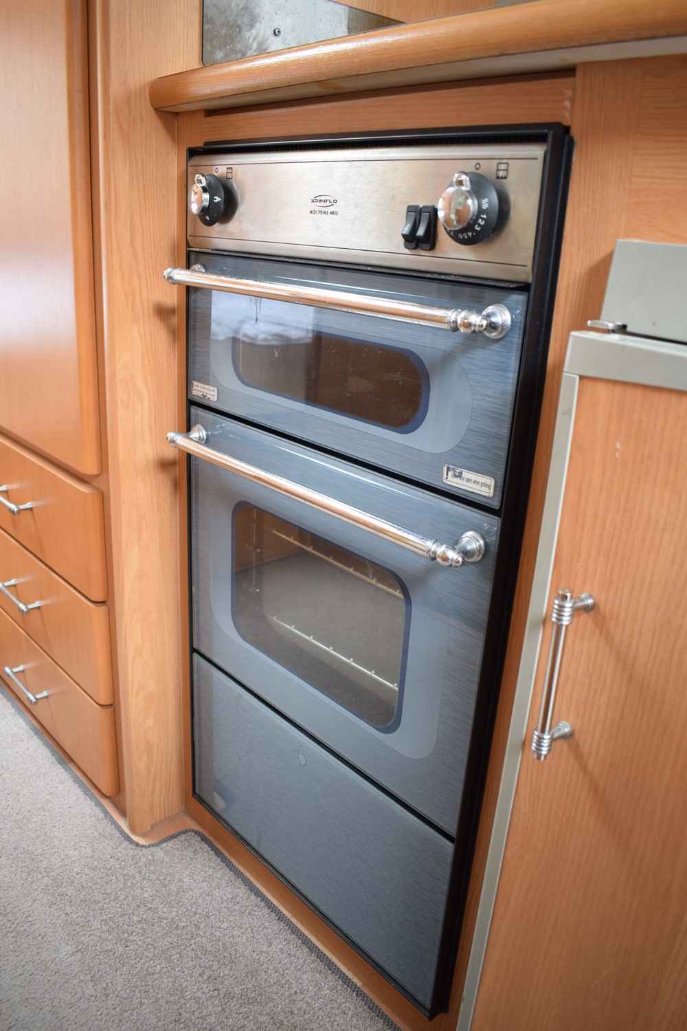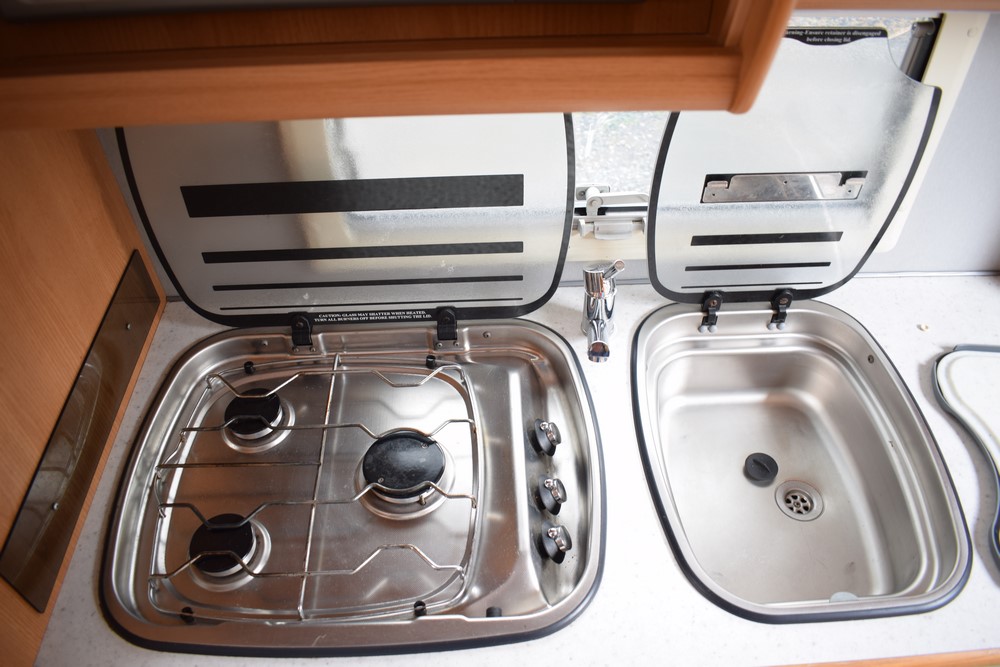 Kuchyň: vedle dřezu se studenou a teplou vodou je vařič se 3 plynovými hořáky. Kromě vařiče je instalována také plynová trouba a nad ní je plynový gril. Plynová trouba je vybavena termostatem. V kuchyňce je lednička s mrazícím boxem. Lednička může chladit na plyn, nebo 220V pokud jste připojeni k síti, nebo na 12V během jízdy (auto musí mít 13 pin zásuvku). Instalována je také mikrovlná trouba.